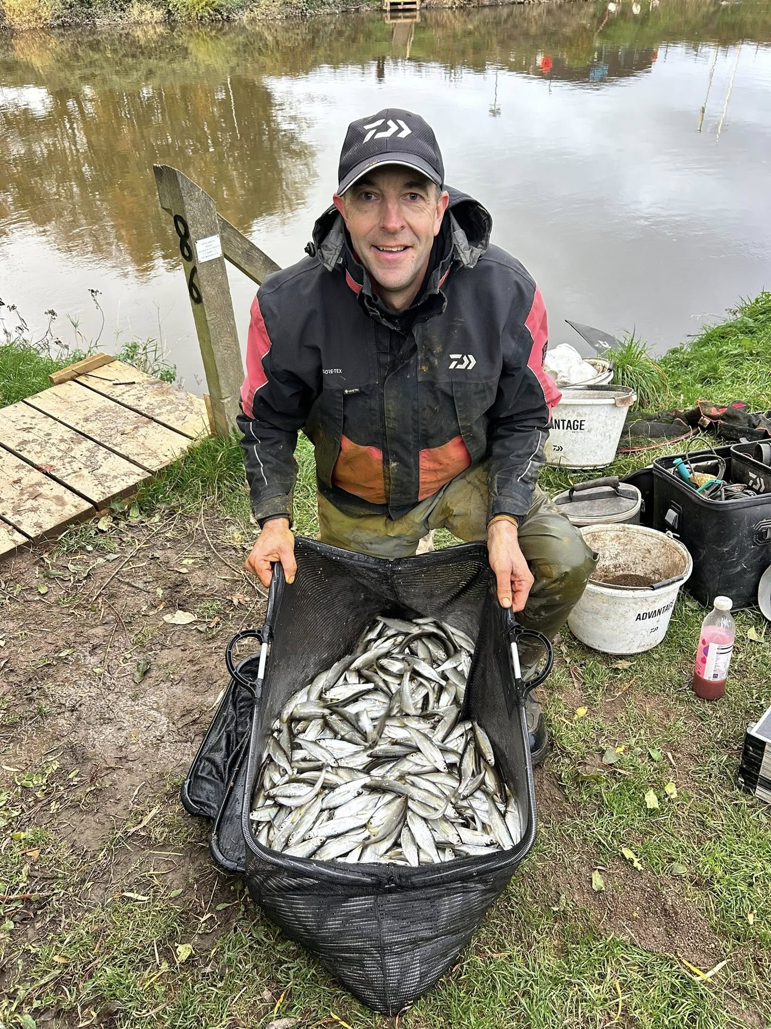The river fished hard in the end with quite a few dry nets, but former Wye Champion Hadrian Whittle decided to set up shop and fish for bleak from his peg on the Asda bank just upstream of the Sea Cadets building on the opposite bank. The bleak catcher extraordinaire  from Ross on Wye caught a good stamp of fish during the match, although they vanished at times, and he ended up with 1080 bleak which combined with his11/2 lb of roach gave him a total weight of 52lb.  This was enough to take the coveted  trophy for a second time in 5 years and prizemoney of £800.