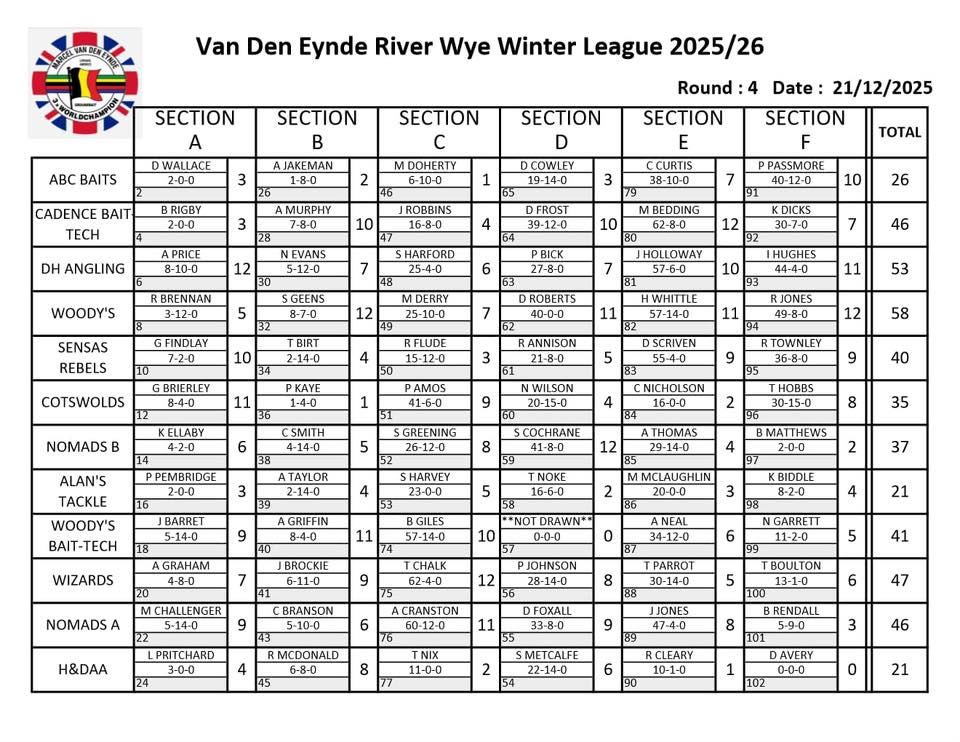 On the team front, Woodys came out top on the day with a total of 58 points, thanks to 2 section wins and 2 second places in their 6 man team. Second place on the day went to DH Angling who totalled 53 points, with Wizards taking 3rd place with 47 points. On the league front Woodys consolidated their place at the top and extended their lead with a perfect 36 points after 3 matches. Nomads A held on to second place with 29 points with DH Angling remaining in third place on 28 points just 1 point behind Nomads A. The next round is due to be fished in 2 weeks time on Sunday 4th January 2026. Can Woodys take maximum points again or are they unbeatable? Full results below:
